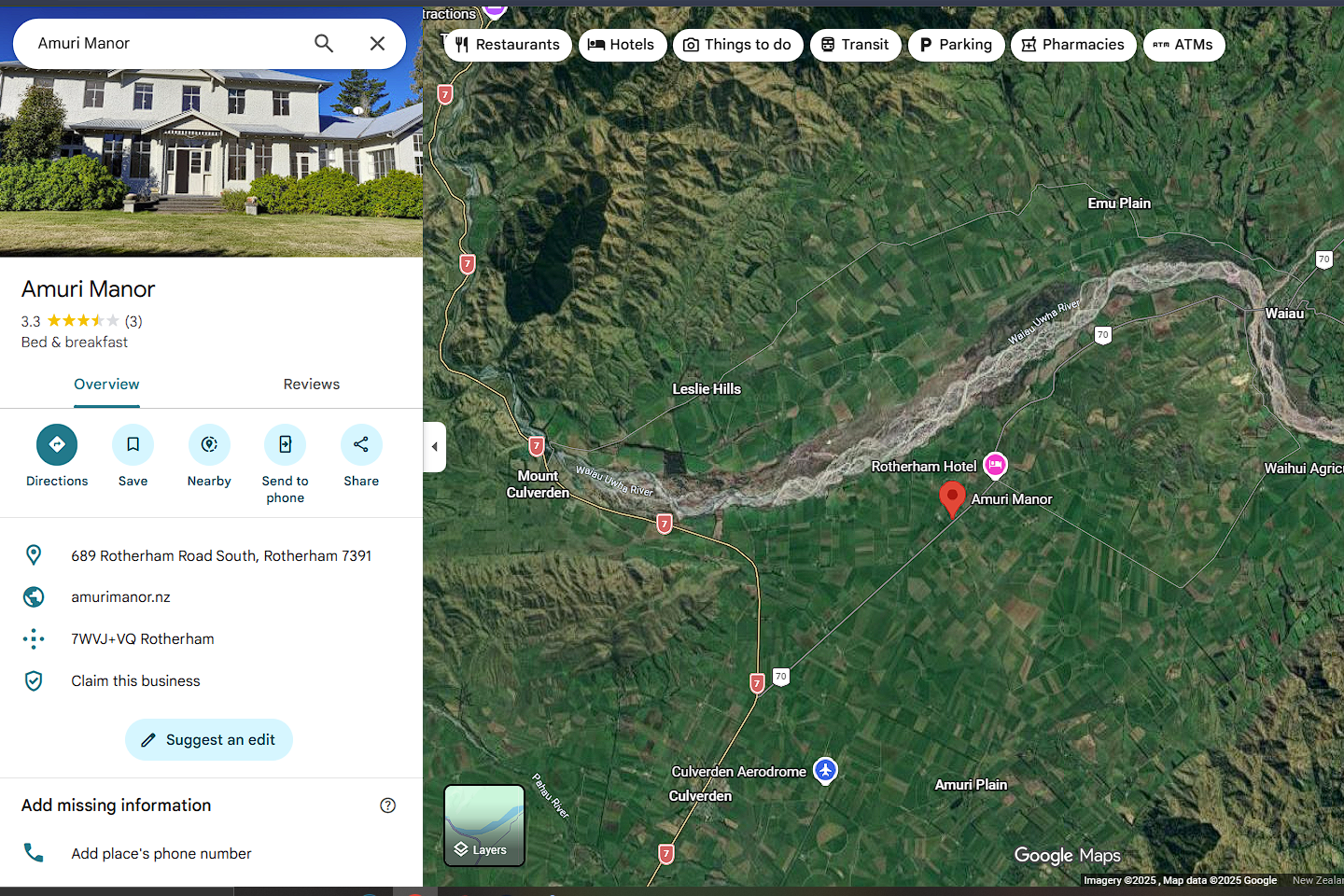 Amuri Manor is off the main visitor highway between Christchurch and Hanmer Springs/ Arthurs Pass.