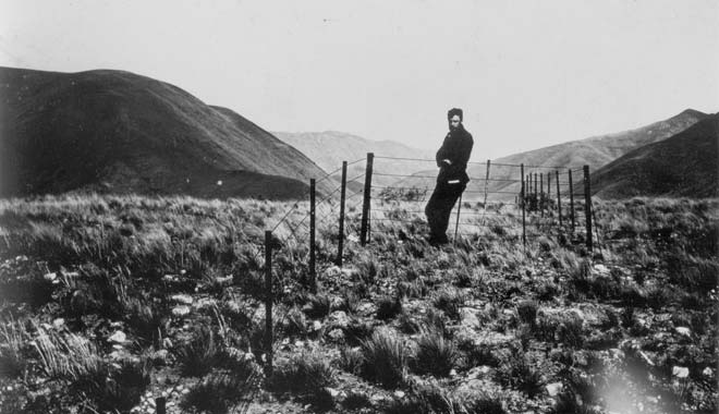 Young Alexander McKay on the Hope fault at Glynn Wye after the 1888 earthquake; he rightly interpreted the uplift and dextral lateral movement shown by the offset fenceline. The surface break runs from L to R across the photo; McKay stands on the high side.