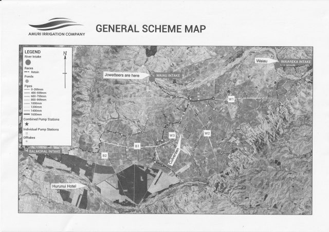 Map of Irrigation Scheme, Culverden Basin (Culverden marked centre, Waiau Intake marked top).