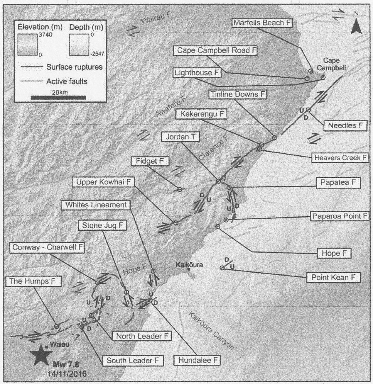 In North Canterbury, a 7.8 magnitude earthquake occurred at 12:02 am on 14th November 2016, with its epicentre at 15 kms depth, about 3 miles east of Rotherham and 3 miles south of Waiau. This turned out to be the most complex ‘quake ever recorded with modern instrumentation, as the initial break spread northward through a series of faults – more than twenty were involved. As we felt it in Christchurch, the first arrivals were strong but felt to be the usual early arrivals, however after a few seconds other arrivals confused matters and the shaking of our house in Hoon Hay became quite complex, juddering, rolling and bouncing on for some two minutes (the 2010 Darfield ‘quake was about only 50 seconds). At the time most folk probably thought it must be coming from the Alpine Fault, but this was not so; a simple, relatively small fault near Rotherham/Waiau had broken, but this was followed by a break on an adjacent fault a few kilometres away, then another and another, and so on, all the way to and beyond Kekerengu and then offshore and into the southern part of Cook Strait. The onshore extent of these breaks followed mapped and previously unmapped faults and exceeded 160 kms and marine surveys later traced the offshore continuation on other faults. Large sections of the Kaikoura coastline were uplifted, some up to 10 metres. A tsunami over 6 metres high was recorded near Kaikoura and on tide gauges at three other locations on the east coast of North and South Islands. Onshore surveys immediately after the ‘quake showed widespread lateral movements of between 6 and 10 metres and modelling has shown some faults had up to 20 metres slip at depths of 10 to 15 kms. Landslides were everywhere; some 10,000 were recorded, destroying roads, railway lines and bridges, and damming rivers to form new lakes.